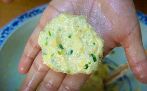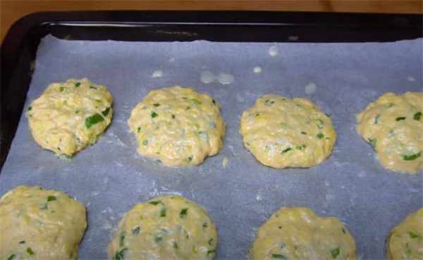 3.準備150g的面粉,切好的黃油倒進去,3g的泡打粉,加入蔥花攪勻,再加入80g的清水揉成面團,手心塗抹一些水或者油防粘,揪適量的大小,團一下按扁,這樣一個小胚子就出來瞭。