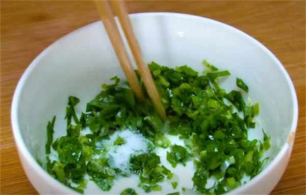2.小蔥切成蔥花,蔥花裡面加入3g的食用油,攪勻防止蔥花出水,然後再加入3g的食鹽。