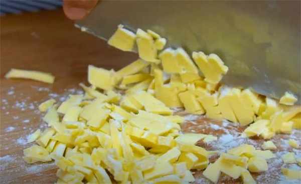 1.準備50g的黃油切碎,撒一些面粉防粘,切好之後備用。