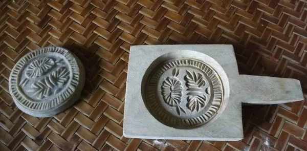 揉搓完瞭摘一小團,捏成小碗形包上餡料,然後有模具印出花樣!