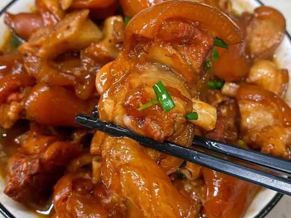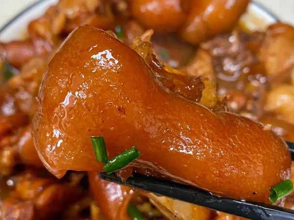 紅燒豬腳肉皮油光鋥亮的,是一道酒席上面的硬菜,入口即化,不肥膩。