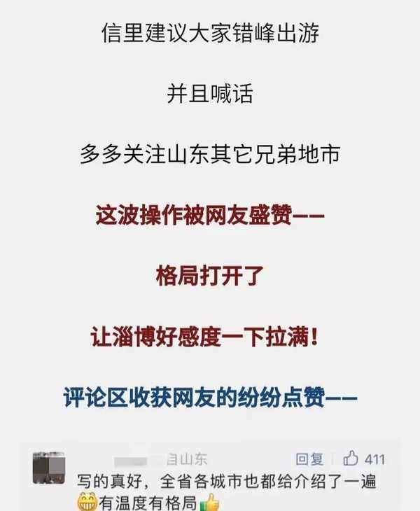 首先是感謝大傢對淄博的厚愛,淄博是一座溫馨美麗的城市,四季皆美景,天天有美食。信中也反省瞭自身服務供給的不足,推介瞭山東深厚的歷史文化,而後再說“美景美食不止淄博,好客山東應有盡有”,還提到瞭山東其他更多的旅遊景點,倡議大傢錯峰出行。