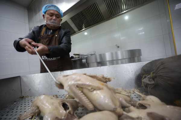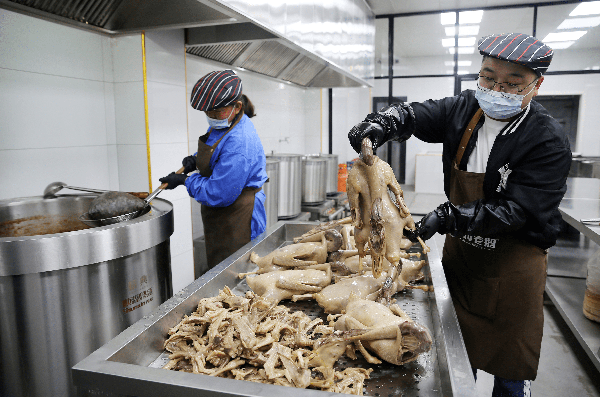 1月10日,濉溪縣南坪鎮任集憶食村老鵝作坊正在加班趕制淮北市非遺產品----憶食村鹵鵝,供應春節市場,滿足食客需求。