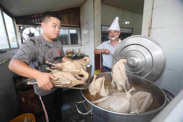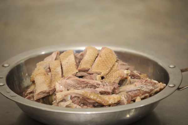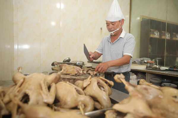 鹵鵝的制作工序復雜,不僅嚴格把控調和、香氣、味道和火候等要素,更遵循“三浸三吊”的古法,使鵝得到充分浸煮,在保證入味的同時,保留嫩滑的口感,鹵出的鵝皮薄肉厚。鹵鵝的味道和標準始終如一,最關鍵的莫過於選鵝用鵝和鹵煮料包的配方。鵝用的是從周邊農戶傢中收購的兩年半左右的散養公鵝,常年在河湖裡散養食草,鵝肉質緊,鹵出的鵝肉更勁道。祖傳秘制的鹵煮料包,含八角、桂皮、花椒、小茴、香葉、丁香、草果、白芷、肉蔻等30餘種中藥材,加少許食鹽,經過三個小時鹵制,鹵出的鵝色澤鮮亮,口感濃香。