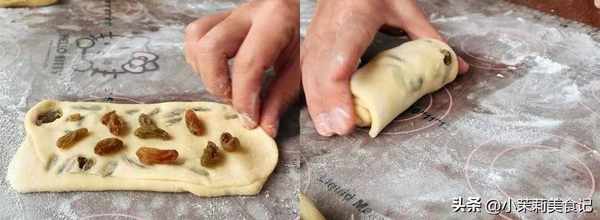5、讓面團繼續松弛5分鐘,然後在揉面墊上分成 小劑子,並且搟成長方形的薄片,先鋪上一層葡萄幹,接著兩邊對折,再放一層葡萄幹,然後卷起來。將所有的小劑子都如此整理好。然後用保鮮膜蓋住,進一步發酵至體積膨脹。
