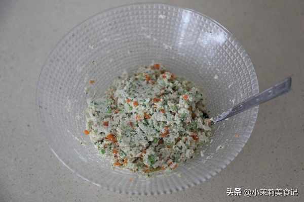 3、豆腐放進碗中,先用勺子壓碎,接著把西蘭花和胡蘿卜放進去,打入一個雞蛋,調入少許鹽,裡邊可以加入一些面粉,然後拌勻。