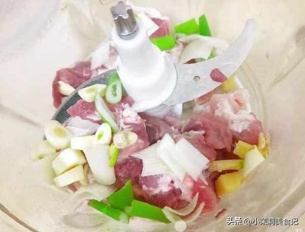 1、適量的豬肉,最好帶點肥肉,切成小塊後,放到絞肉機裡邊,同時放一些蔥薑進去,然後啟動絞肉機攪碎。