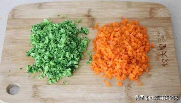 2、接著把西蘭花和胡蘿卜分別在幹凈的案板上切碎。