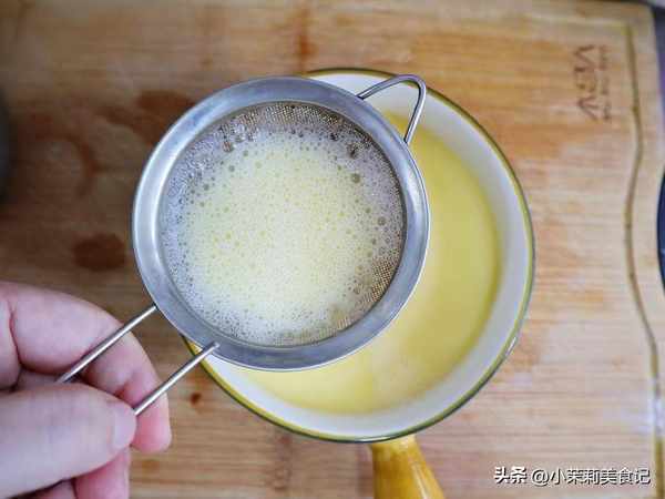 3、為瞭避免蒸出的蛋羹裡邊蜂窩太多影響口感,我們過2遍濾篩,把蛋液過濾到蒸碗中。