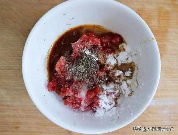 1、準備一些瘦肉,洗凈以後切碎,調入一些生抽,白胡椒,淀粉,攪勻以後,再淋一少許食用油,繼續拌勻醃制待用。