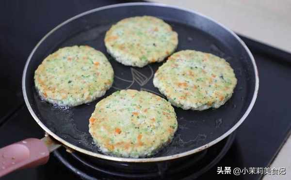4、平底鍋裡放一點油預熱,把豆腐蔬菜泥整理成小餅的形狀放進去,然後保持中小火來煎,下面的部分定型後,輕輕翻面繼續煎,直到上下兩面都定型餅上色,就可以出鍋瞭。