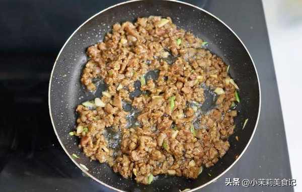 5、起鍋燒油,把醃過的肉丁放進去,炒至變色斷生,接著加一些蔥花進去增香,徹底炒熟後,就可以關火瞭。放到蛋羹中,就可以享用瞭。