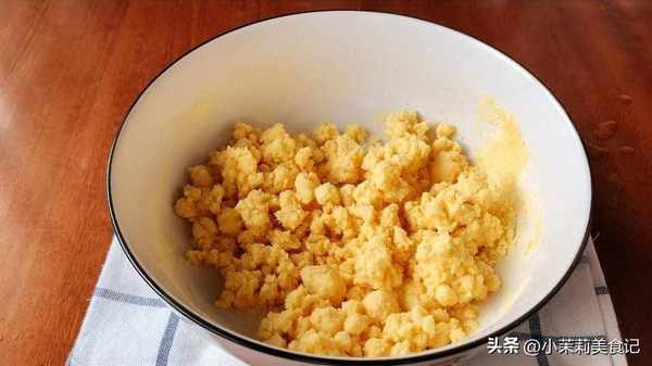 2、200克左右的玉米面粉,放到碗裡,沖入適量的熱水,用竹子材質的筷子來攪拌成面疙瘩,以免燙到手。然後在室溫下晾涼。