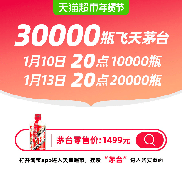 1月10日,天貓超市方面確認,本周將放出30000瓶1499元的飛天茅臺,這是農歷新年之前最大的一次放量。活動從今晚8點開始,天貓超市先放出10000瓶,1月13日晚同一時間再放出20000瓶。過年能否在飯局上喝上一口茅臺,就看這波瞭。