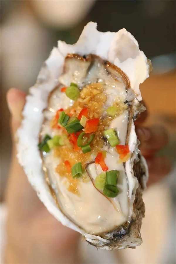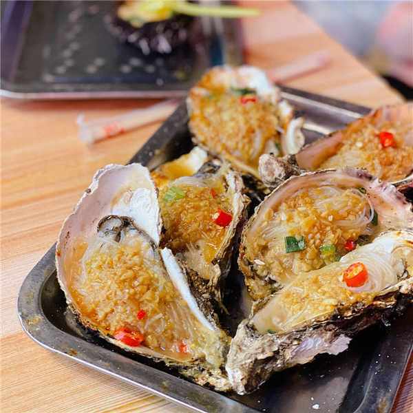 說到威海,不得不提的就是個大飽滿的海蠣子瞭。鮮活現開的海蠣子放在烤爐上,蓋上滿滿一勺秘制蒜蓉小醬料,加上切碎的紅椒和蔥末,隨著溫度升高,海蠣子本身的湯汁開始咕咕冒泡,肥嫩的蠣肉也跟著湯汁輕輕鼓動。