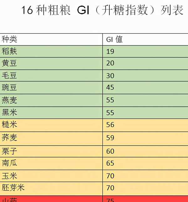 所以我們在吃主食時,主要以升糖指數GI值為依據,多吃低GI值(55以下)主食,少吃高GI值主食(70以上),在血糖控制較好的情況下,高GI主食可以與低GI主食混合著吃。