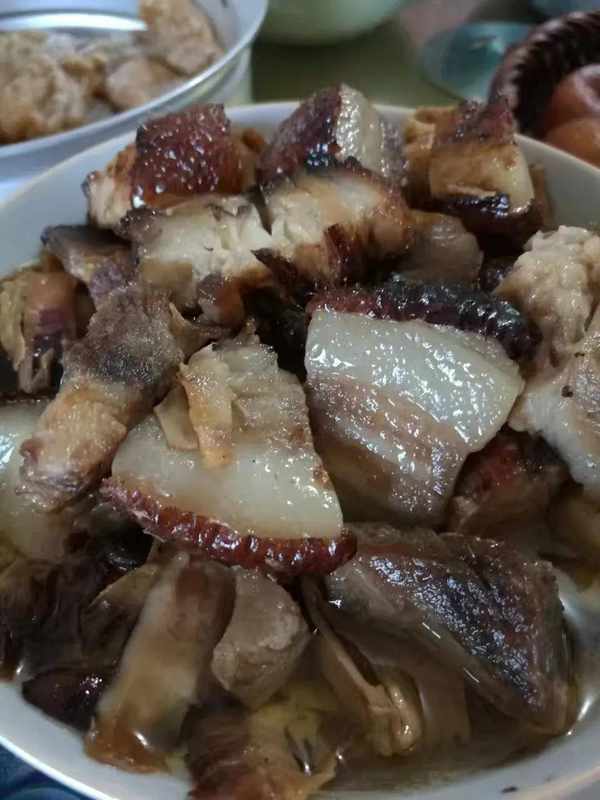 村子裡每戶人傢,都會從生產隊或殺年豬親戚那裡買上十斤八斤豬肉,刮毛洗凈放進大鐵鍋煮至六七成熟,然後拌上紅糖蜂蜜水扔進高溫油鍋煎炸至金黃色,然後撈起放回大鐵鍋,與大羅卜塊和油菜頭一起,再加上整雞整鴨一起混煮,直至熟透撈起晾幹,再切成厚厚的肉塊再放回小鍋配料燜爛裝碗上桌,那油光黃亮,肉香四溢的一大海碗燒豬肉,至今仍是老傢年夜飯的頭道名菜。