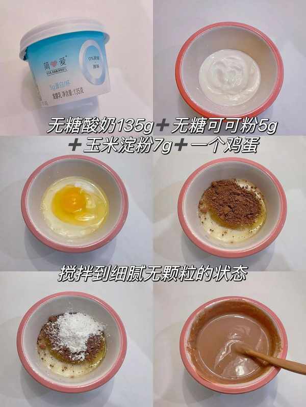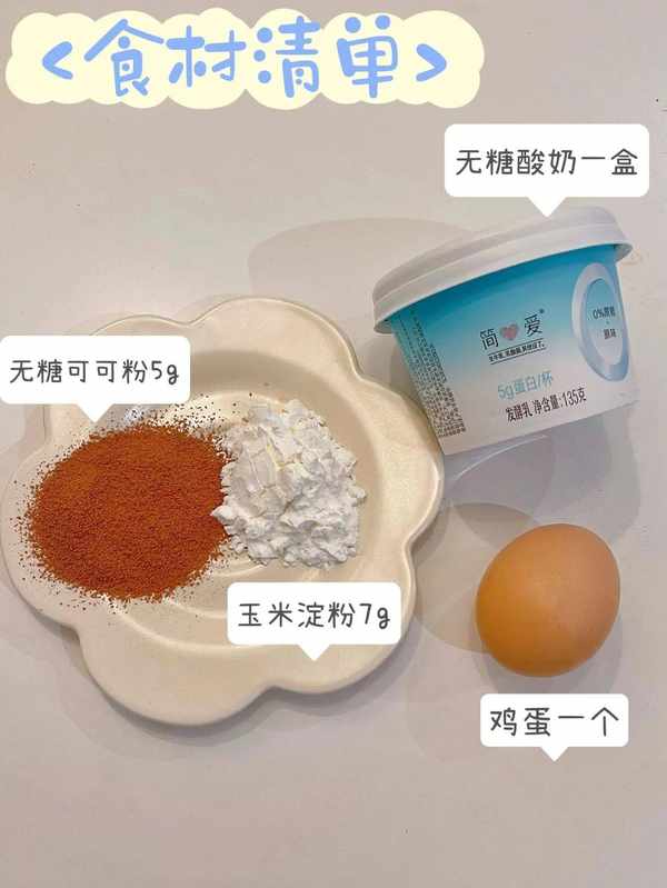 0蔗糖酸奶一盒,雞蛋1個,玉米淀粉7g,無糖可可粉5g.