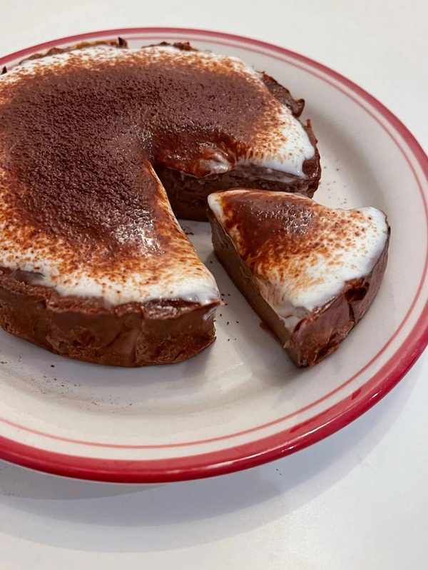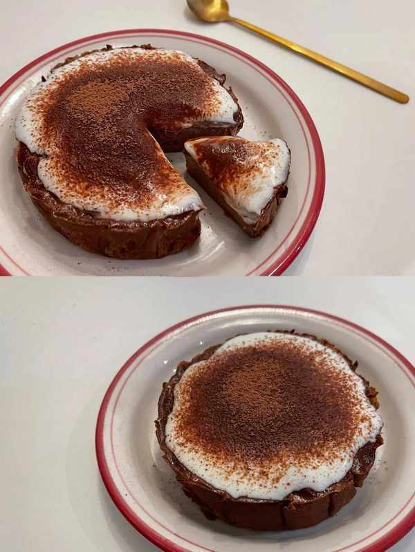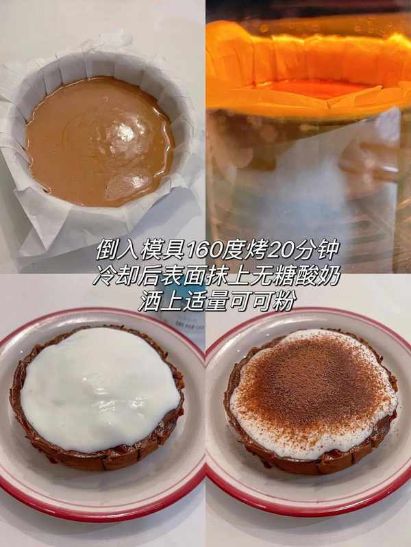 ④.取出後冷藏降溫,在表面淋上濃鬱的無糖酸奶,再撒上一層可可粉.