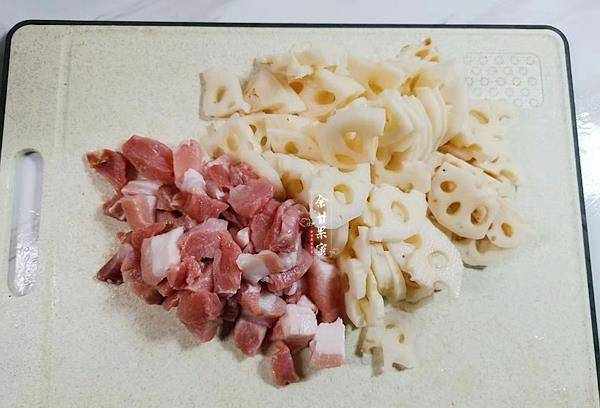 第1步:先制作餡料,將蓮藕去皮切成小片,去皮後有220克、豬肉切後切成小丁;