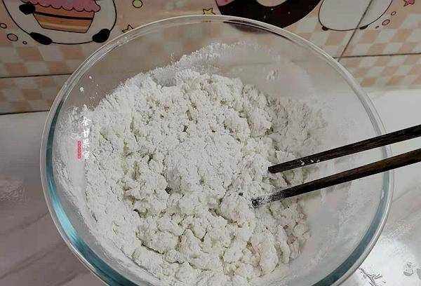 第4步:將糯米粉、粘米粘放到容器中,加入剛剛燒開的開水220克,開水要慢慢地少量添加,邊倒邊攪拌,不宜一次性加入,可留下少量開水,根據面團吸水量而定;