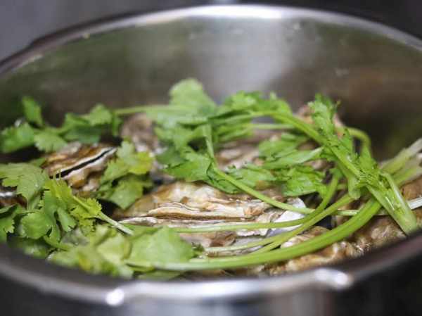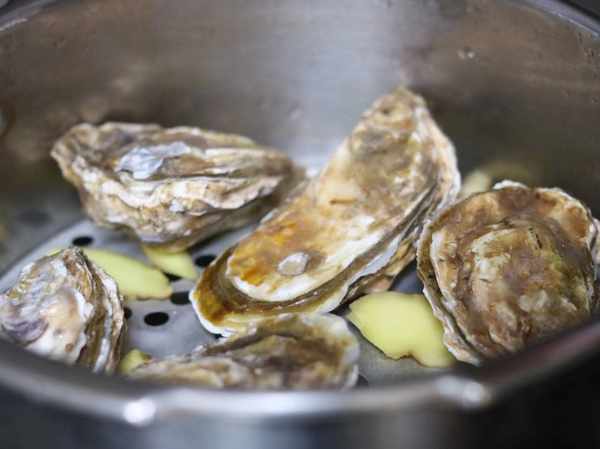 第三步,高壓鍋中加入1大碗清水,放入蒸架,接著把洗好的生蠔放進入。接著擺放上薑片、香菜,蓋上蓋子,開火。