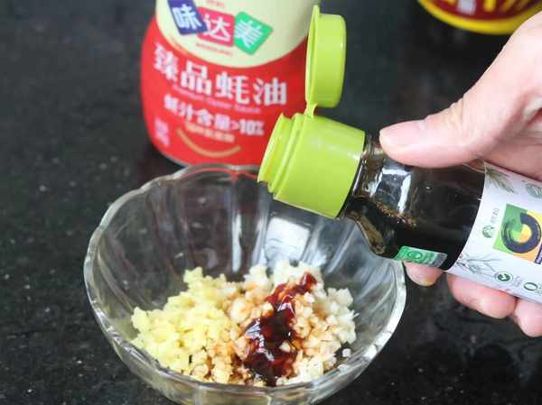 第四步,薑蒜洗凈切末,放入碗中,倒入1勺味達美臻品蠔油、1勺半禾然有機醬油、1勺芝麻油,擠入2勺檸檬汁,攪拌均勻。