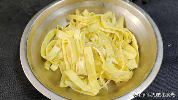 第三步:準備兩個雞蛋打散,往雞蛋液中加入少許的幹淀粉攪拌均勻,而後用不粘鍋燒熱將蛋液攤成兩張雞蛋皮,再將雞蛋皮切成長條待用。