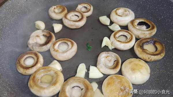 第五步:一切準備妥當,開始上鍋烹飪。先在鍋裡來少許食用油燒熱,將所有口蘑下鍋煎一煎,煎至兩面微黃,口蘑內出水時加入蒜粒炒出香味。