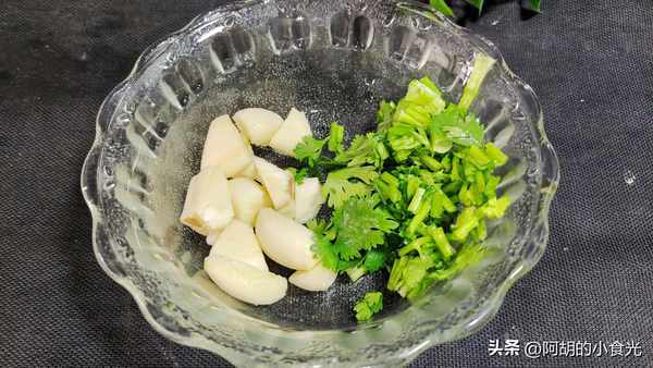 第四步:再來準備一點小料,大蒜瓣3個切成粒,香菜一棵切碎備用。