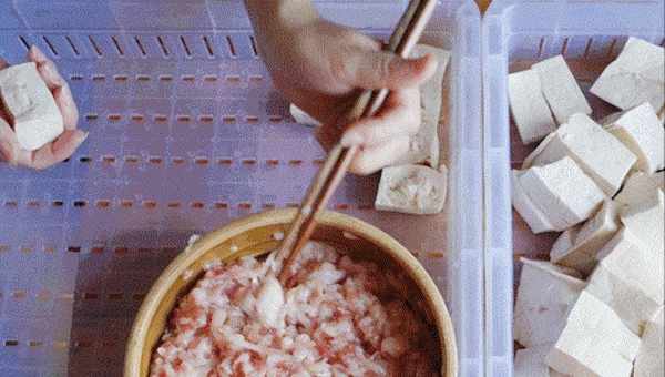 取適量豆腐、五香肉、香菇,並加入蔥、蒜末、鹽、五香粉調味。將生薑和五香豬肉切成肉末。同時將香菇切碎以獲得新鮮。將肉末和香菇末放入碗中,加入蒜末和適量的鹽五香粉,攪拌均勻備用。豆腐的選擇非常重要。市面上的水豆腐和內酯豆腐都不好。它們太嫩或者老豆腐味道不好。因此,板豆腐是首選。板豆腐是我們口中的營養豆腐。味道介於老豆腐和水豆腐之間。它最適合釀造豆腐。