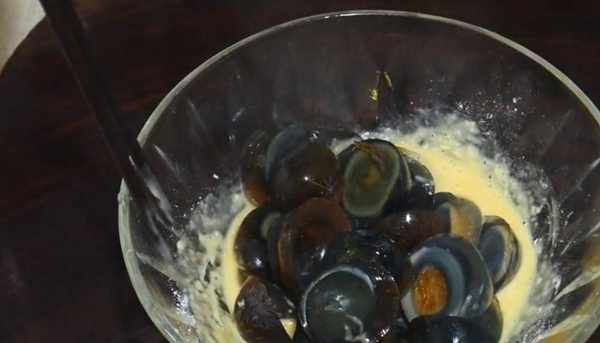 皮蛋煮開瞭,然後用漏勺將皮蛋撈出來,碗裡放涼水,把皮蛋放進去。皮蛋過涼水後將皮蛋的外殼去掉,然後改刀將皮蛋切成片。皮蛋卷切完片後拿出一個碗碗裡打入一個雞蛋,然後將雞蛋的蛋黃搗碎。雞蛋攪拌勻後,往裡面倒入一些面粉,用筷子攪拌均勻。面糊攪拌到沒有幹面粉的狀態之後,就可以把切好的皮蛋倒進去,讓每一個皮蛋都能裹上面糊。