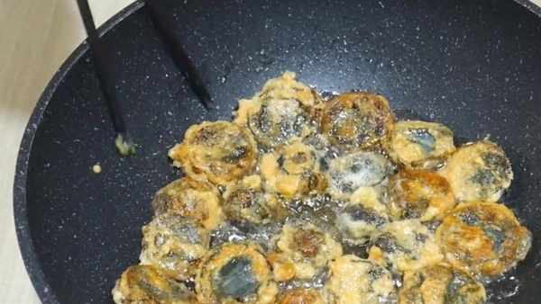 起鍋燒油,鍋裡倒入適量的食油,油熱後放入皮蛋。用筷子依次將裹好面糊的皮蛋放入鍋中。皮蛋全部下鍋之後,輕微地晃動一下鍋,防止它們粘鍋。皮蛋的一面微微煎黃之後,就翻一個面。將另一個面也煎至金黃色,然後兩面都煎黃瞭之後,把它夾出來放在碗裡。
