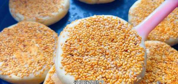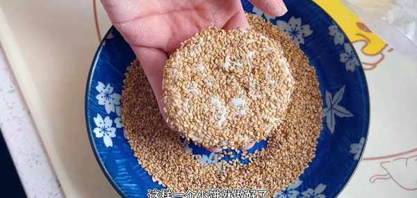 再盤裡放一些白芝麻,把小餅表面沾上芝麻,生的熟的都可以的 給它按成餅狀,同時芝麻也會粘得更牢固一些,這樣一個餅皮就做好瞭。是不是非常的簡單