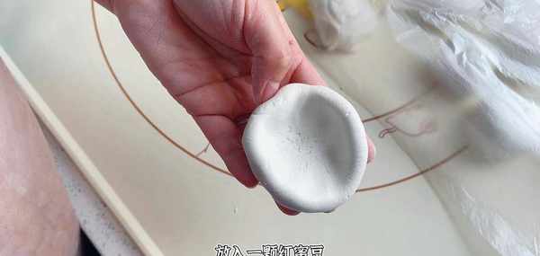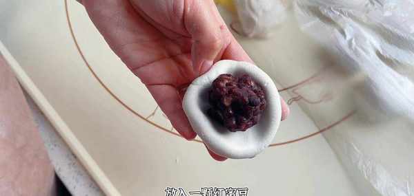 放入一顆紅蜜豆, 邊轉動邊用虎口收口
