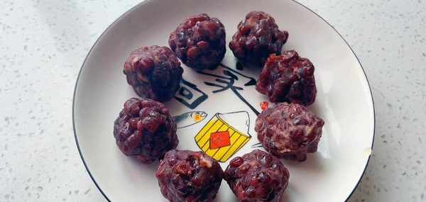 利用這個時間來做餡料,準備一些紅蜜豆倒入大碗裡面。然後稱出30g一分,用手攥緊,搓成圓球,放到盤中備用。這些 一共做瞭 八個