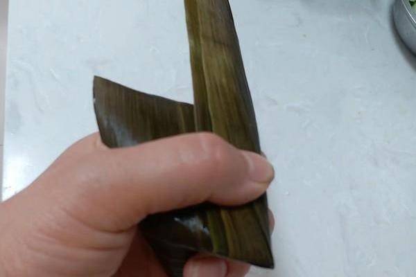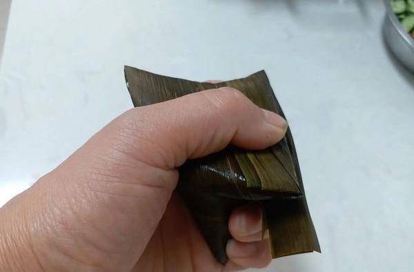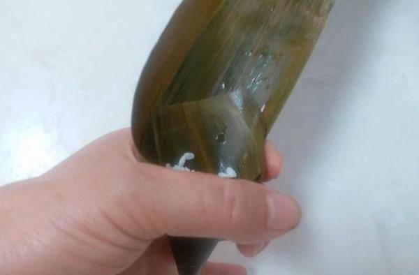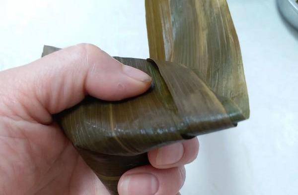 7.粽葉向下蓋上,大拇指要緊緊按住,左邊粽葉一定要蓋住不能漏出米