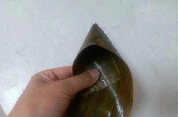 9.右邊的粽葉再向頂部對折,同樣大拇指與食指要緊緊捏住