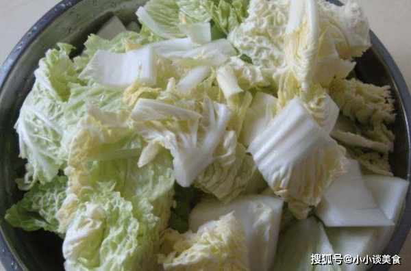 1、先將白菜切成塊,然後放入清水中,加鹽,浸泡片刻,然後將白菜沖洗幹凈。