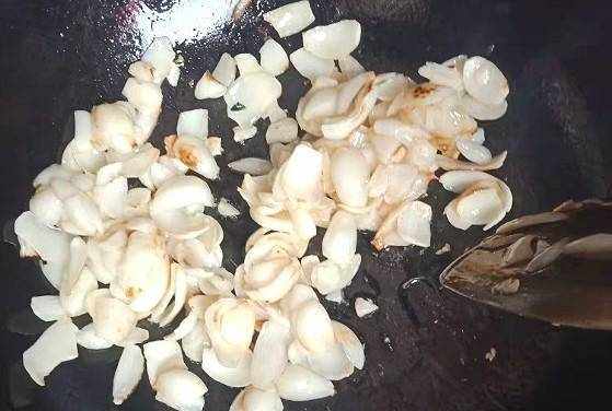 把所有的食材都洗幹凈後,我們就可以開始做飯瞭。在鍋中倒入適量的食用油。當油的溫度達到所需溫度時,加入大蒜和薑。一旦顏色改變,加入百合和芹菜,快速炒三種材料。7歲時,加入鹽和雞湯調味。