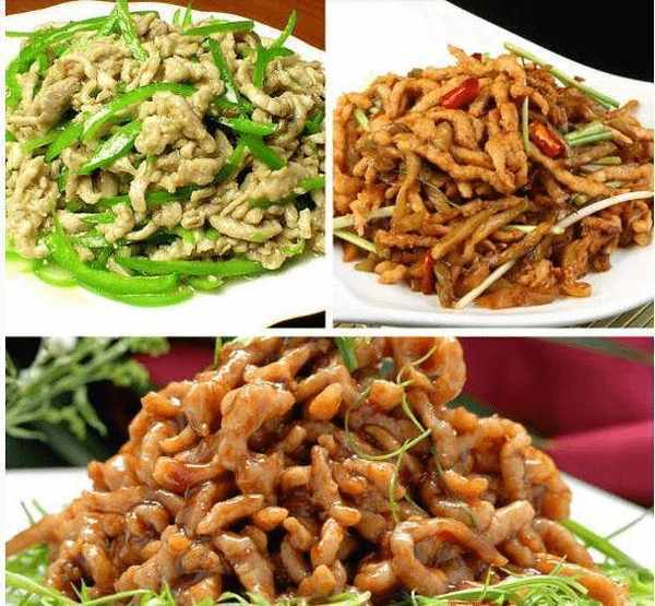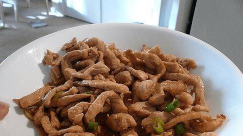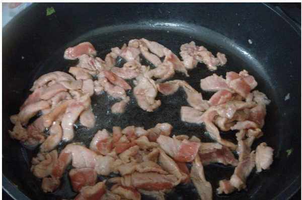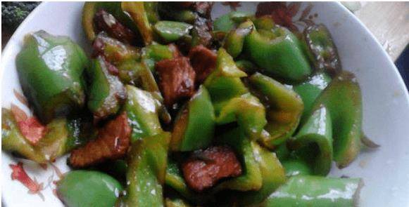 鍋內留油(油不夠可適量加),加入蒜片、薑絲炒出香味,再倒入青椒,炒約30分鐘。1分鐘,再將炸好的肉片全部倒入鍋中,加入適量老抽、生抽,翻炒上色,再加入適量鹽和雞精調味,快速翻炒出味,出鍋平底鍋。