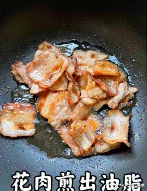 5:鍋底預熱加上食用油,等待油溫燒熱乎,倒入醃制好的五花肉,快速煸炒出肥膩的油脂,迅速翻炒均勻。