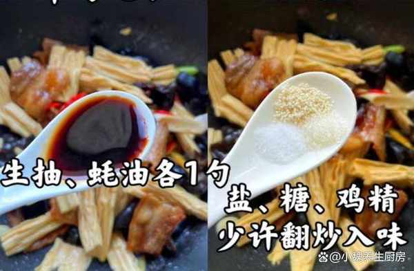 7:倒入黑木耳和腐竹,加上生抽和蠔油各一勺,分別加上半勺食鹽,半勺雞精和胡椒粉,迅速翻炒幾下。