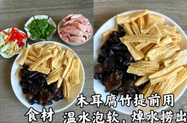 1:提前購買好腐竹,木耳,五花肉和其他,先把黑木耳用溫水泡發好,切掉一部分的黑色根蒂,或者用熱水焯燙處理,去掉一些臟東西,洗凈切成塊備用。