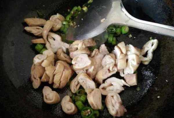 第四步:將切好的大腸倒入鍋中,大火翻炒,待大腸變色後加入少許鹽,這樣炸出來的大腸會更入味!大腸再炒兩分鐘。煮熟後加入少許雞精,提鮮。我想把它做大,這樣味道會更好。炒勻後即可出鍋。