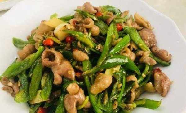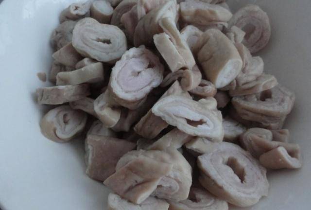 第二步:肥腸洗凈後,倒入少許醋。清洗可以去除肥腸的異味,口感會更好!肥腸洗凈煮熟,煮熟的肥腸切成小塊備用。然後將準備好的青椒再次沖洗幹凈,去掉花椒的蒂,將花椒切成小塊。切辣椒的時候,盡量切小一點,這樣更容易炒熟,味道也更好。!