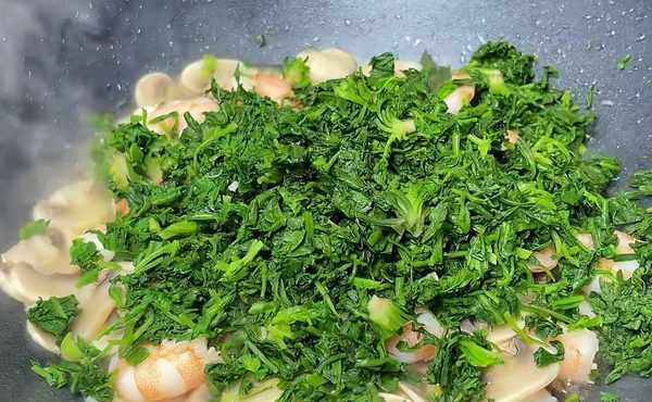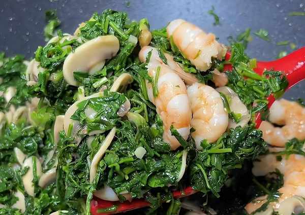 食材準備:薺菜、口蘑、蝦仁、小蔥。