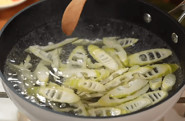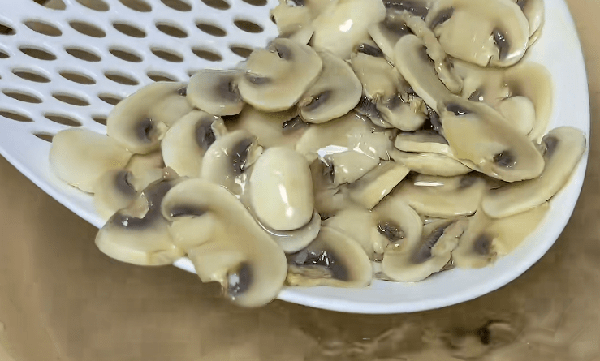 3.將口蘑清洗幹凈,切成薄片放入開水中焯燙一分鐘,撈出瀝幹水分備用。