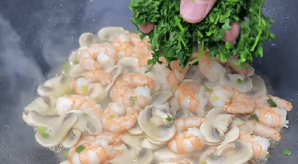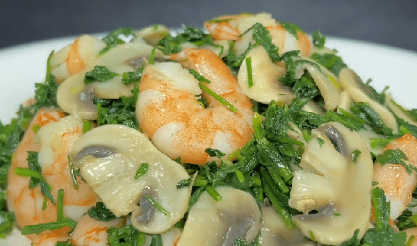 4.熱鍋冷油放入蔥花炒香。倒入蝦仁、薺菜、口蘑翻炒出香味。再放入少量食鹽,少量雞精,兩勺淀粉水炒勻後撈出裝盤就做好瞭。