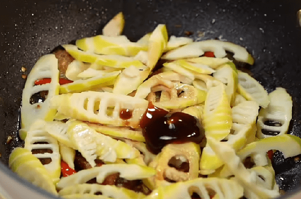 5.將春筍放入鍋中,小米辣,加入一勺生抽、一勺食鹽、一勺雞精,翻炒均勻就做好瞭。